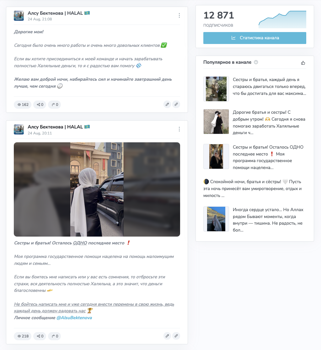 На 3 сентября 2025-го года телеграмм-канал «Алсу Бектенова Halal» находится в статусе приватного. То есть сейчас на него нельзя подписаться. Так обычно происходит с аккаунтами, владельцев которых администрация мессенджера подозревает в мошенничестве.