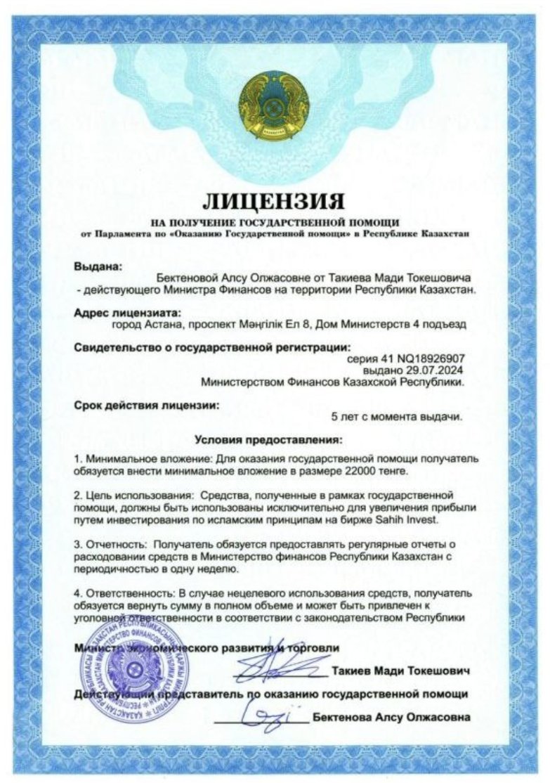 Девушка утверждает, что способствует получению помощи от государства. В качестве подтверждений своим словам приводит фотографию некой лицензии, но данный документ оказывается подделкой. В Республике Казахстан нет программы, по которой можно получать финансовую помощь для направления ее в халяльные инвестиционные проекты.