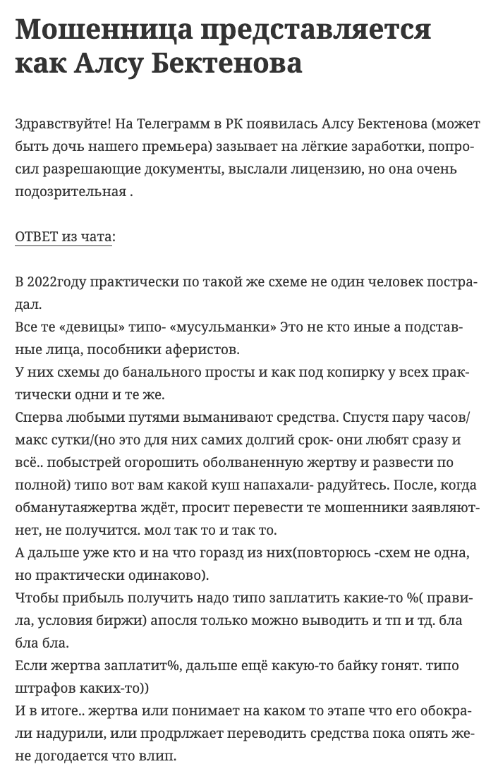 Мы нашли только одно разоблачение Бектеновой Алсу Олжасовны, и его авто пишет, что проект данной девушки — это мошенничество. Он рассказывает, что данная скамерша использует множество разных психологических уловок, чтобы выманить из жертвы как можно больше денег.