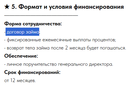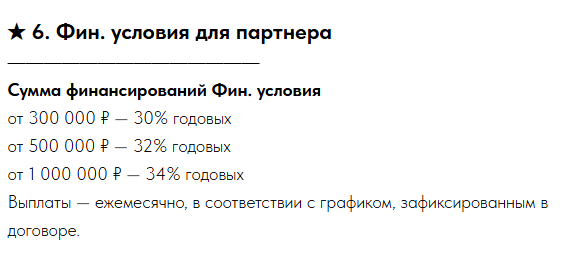 Вложение возможно по одному из трех вариантов на срок от 12 месяцев: от 300 тыс. – 30% годовых, от 500 тыс. – 32% годовых, от миллиона – 34% годовых. Выплаты обещают делать согласно договору, при этом как выглядит договор – неясно.