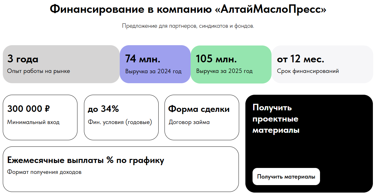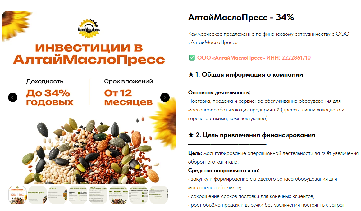 Что ООО МаслоПресс Алтай предлагает инвесторам
