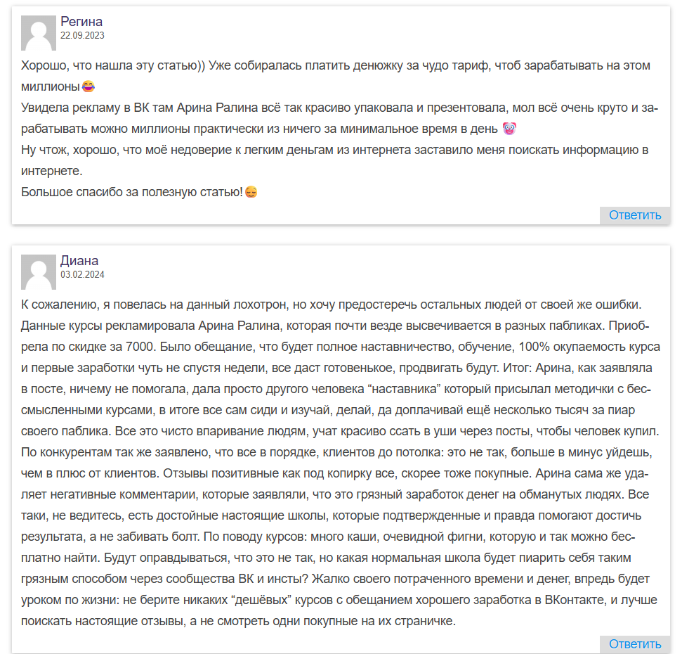 Люди пишут, что положительные отзывы подделанные, а отрицательные под постами Анастасия Кленова, специалист по фрилансу, удаляет сама, как и другие курсоры. Очень много жалоб как на работу службы поддержки, которая не сопровождает студентов от слова вообще, как и на сами учебные материалы, которые недостаточно хорошо структурированы и содержат много «воды».