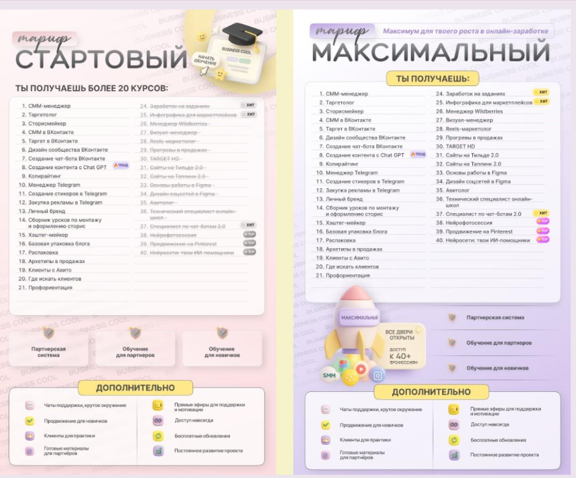 Есть несколько вариантов входа. Первый – приобрести набор курсов. Есть тариф «Стартовый» за 4500 рублей, в которой входит 23 образовательные программы, и «Максимальный» за 7500 рублей. В обоих вариантах доступны своевременные обновления, возможность оттачивать навыки на заданиях реальных клиентов и чат с кураторами.