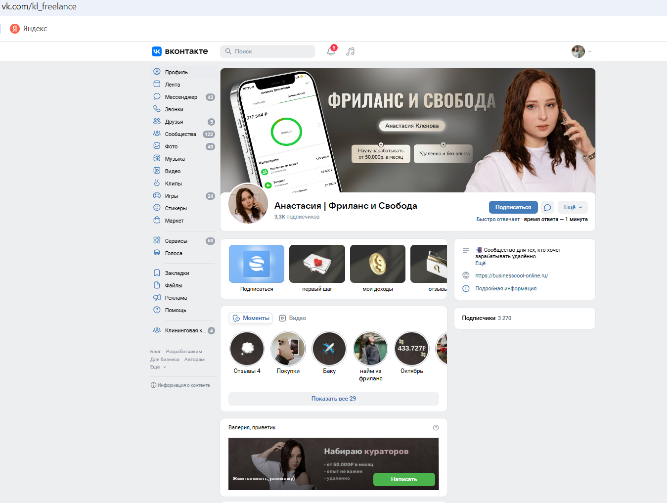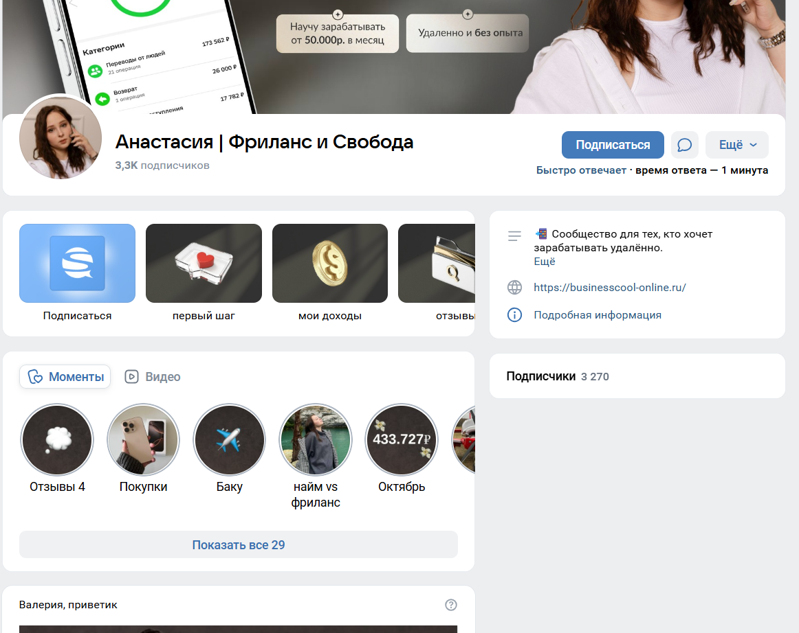 Обзор паблика «Анастасия Кленова | Фриланс и Свобода»