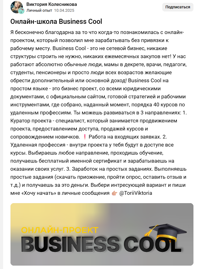 Мы провели обзор работы Businesscool online ru и ее кураторов. Образовательная платформа предлагает 3 разных вариантов заработка: простые задачи, поиск клиентов и трудоустройство после окончания курсов.