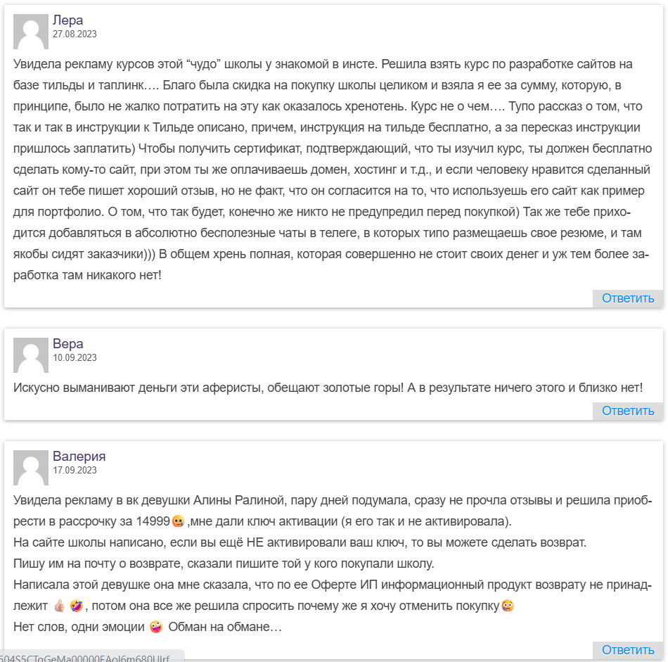 В отличие от откликов на официальной страничке Businesscool online ru, среди которых можно найти только комментарии довольных клиентов, в сети на сторонних ресурсах – только негативные мнения. Клиенты жалуются на несдержанные обещания, вроде вернуть деньги за приобретенный курс, если ключ к нему не активирован, а также на скрытые условия сотрудничества. Выполняя заказ для клиента после обучения по созданию сайтов, надо самостоятельно оплачивать хостинг и домен, возможны и другие планы.