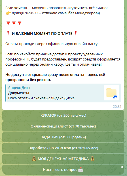 Подобная модель направлена на стимулирование оплаты доступа без предоставления прозрачной информации о фактическом содержании обучения. Оплата производится через онлайн-кассу, однако стоимость доступа заранее не раскрывается. Все детали сотрудничества пользователи обсуждают с куратором в ЛС.