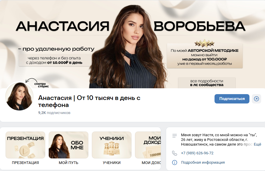 Анастасия Воробьева утверждает, что пользователи могут зарабатывать от 10 000 рублей в день и выйти на доход до 1 000 000 рублей в месяц. Продвижение ведется через сообщество Работа с телефона и моя жизнь, созданное 25 ноября 2024 года, а также через личные сообщения, Telegram-бот и страницу во ВКонтакте.