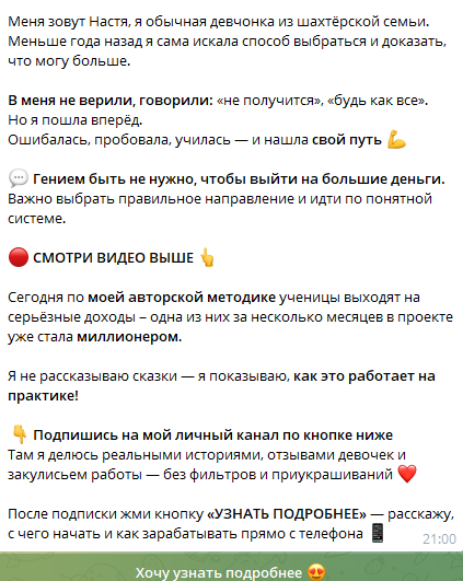 Проект Работа с телефона и моя жизнь Анастасии создан для того, чтобы девушка продавала материалы по удаленному заработку с обещанием высокого дохода без опыта. При этом финансовая модель основана на продаже доступа к инструкциям, а не на предоставлении гарантированной работы или выплат.