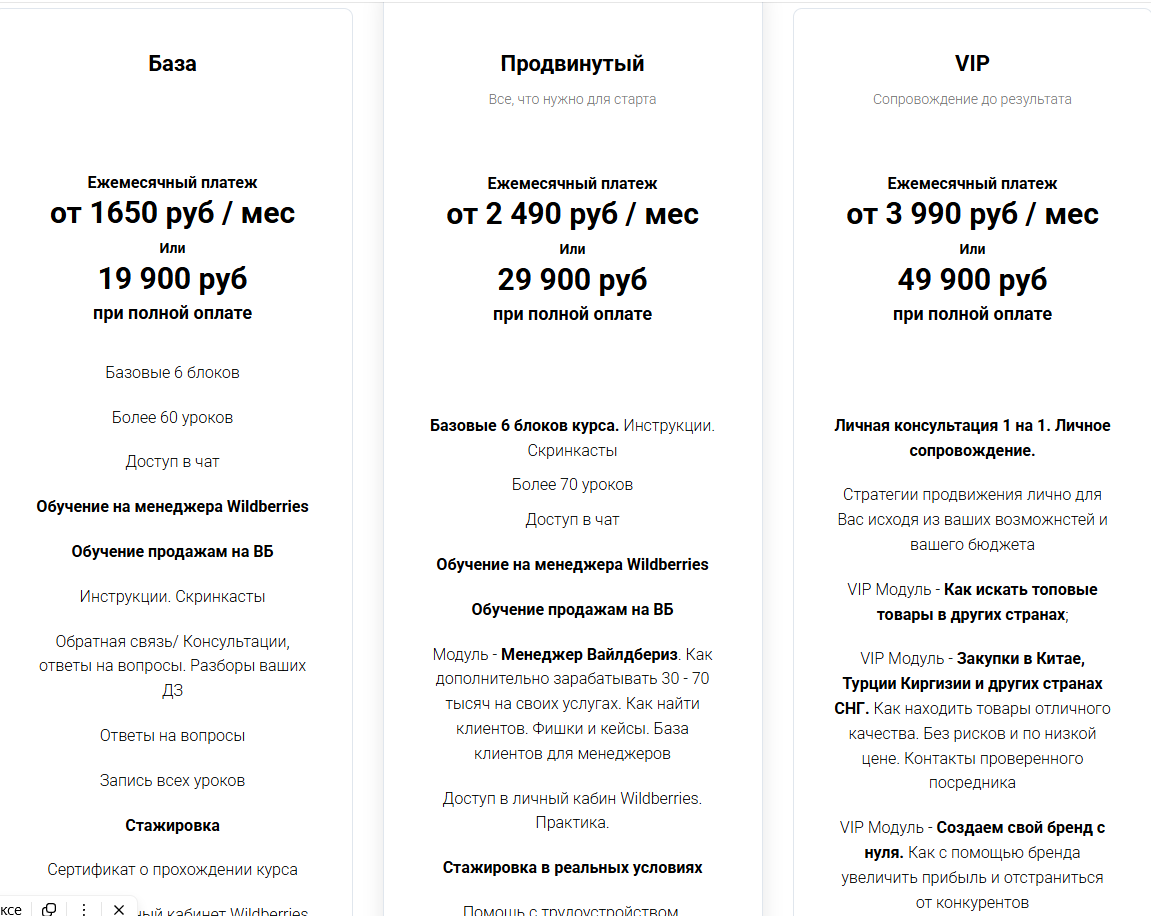 Обучение по маркетплейсам представлено в трех тарифах: База за 19 900 рублей, Продвинутый за 29 900 рублей, и VIP за 49 900 рублей.