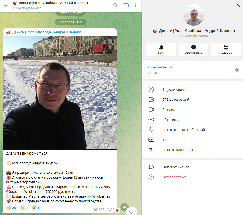 Автор активно ведет социальные сети. Так, блог в Телеграм Деньги Рост Свобода Андрей Шедеви (shedeviwb) был создан в апреле 2022 года. С момента создания на канал подписалось чуть более 1,7 тысячи пользователей.