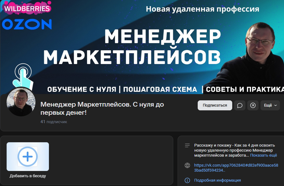 Сообщество в ВК Менеджер Маркетплейсов С нуля до первых денег было создано раньше – в августе 2021 года, но при этом группа была заброшена в 2022 году. Маловероятно, что автор возобновит работу группы.