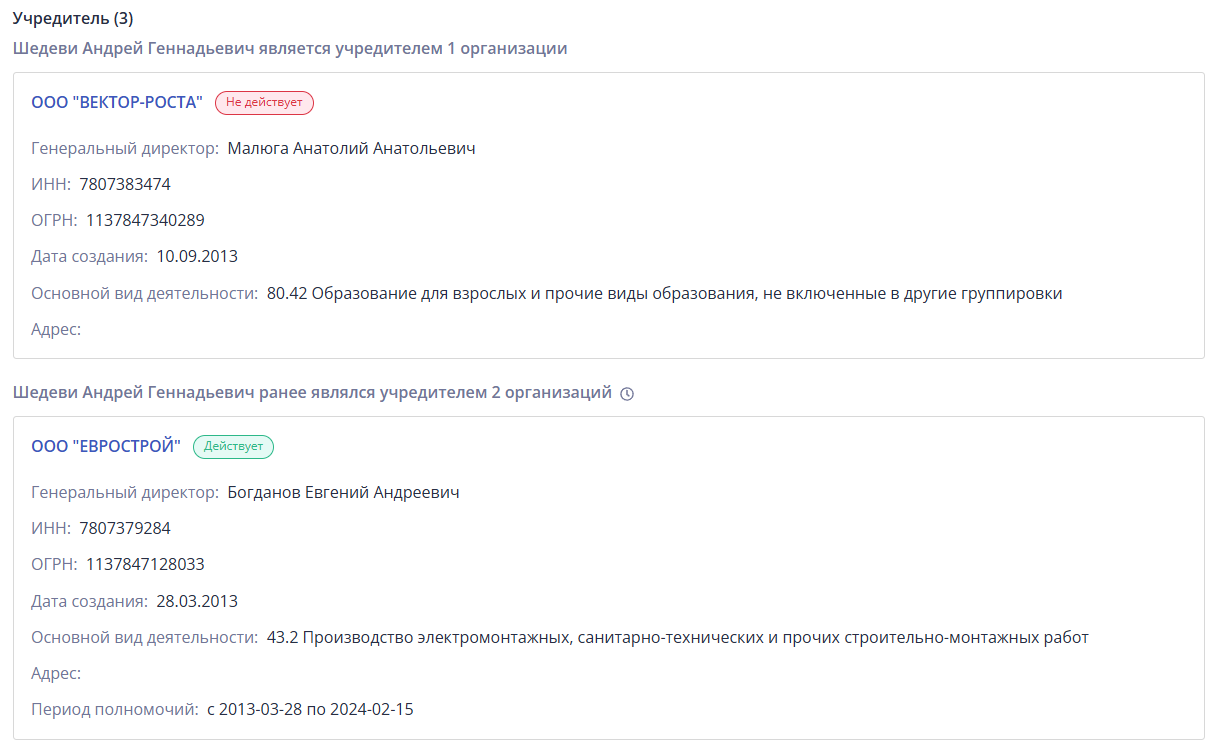 Также Андрей выступал в качестве учредителя сразу трех организаций, одна из которых была зарегистрирована в формате НПД. Продолжает работу при написании обзора только компания – ООО ЕВРОСТРОЙ. Заметим, что 2 компании, к которым причастен Андрей, были созданы в 2013 году, а одна в 2016.