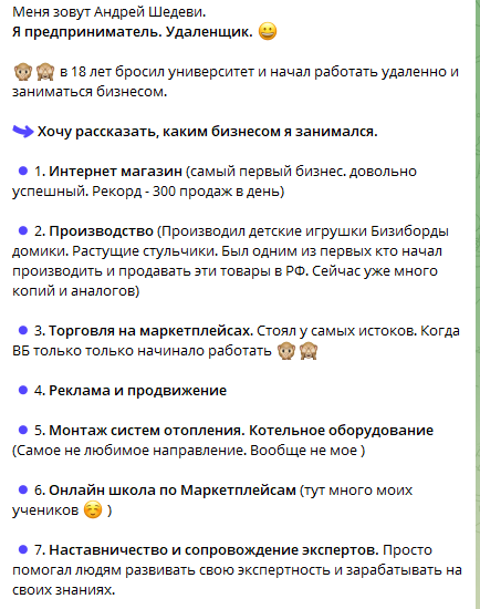 При этом Андрей заявляет о том, что занимается созданием, наполнением и продвижением Телеграм-каналов, за счет чего получает крупные суммы. Так, например, некий неназванный канал он якобы продал за 120 тысяч рублей. При этом что же мешает в таком случае автору развить собственные социальные сети – не уточняется.