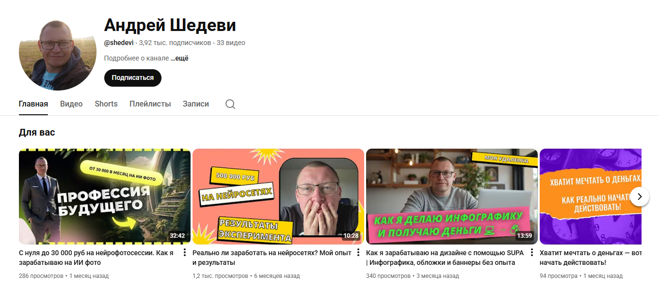 Дополнительно эксперт ведет Ютуб-канал shedevi. На него подписано почти 4 тысячи пользователей. Вероятно, в своих социальных сетях автор не использовал накрутку.