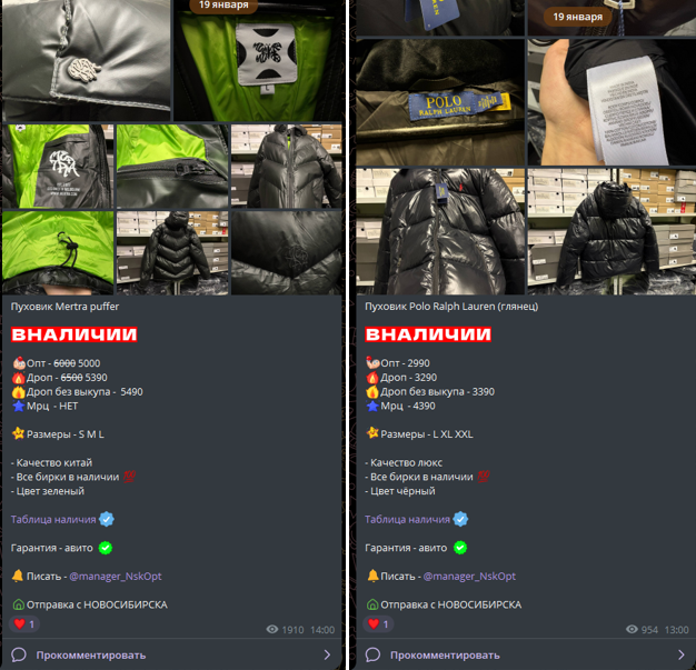 Каталог ТГ магазина однообразный. Это якобы брендовые вещи, для которых указаны цвета и размеры в наличии. В качестве гарантии стоит отметка Авито, но это просто манипуляция мнением потенциальных покупателей. Для каждой позиции указаны цены на опт, дроп, в том числе без выкупа, Мрц. Часто проводятся распродажи по сниженным ценам. Отправка осуществляется из Новосибирска, хотя Андрей и утверждает, что его склад находится в Москве.