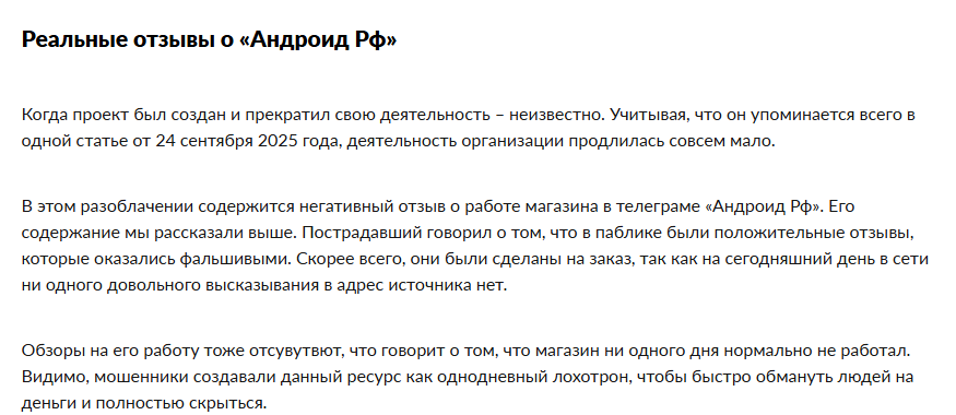 Отзывы об «Андроид РФ» представлены в ограниченном количестве. Деятельность канала длилась недолго и прекратилась после появления первых жалоб. Пострадавший описывает потерю 4200 рублей на предоплате за смартфон, после чего менеджеры потребовали дополнительно 9800 рублей под предлогом таможенной пошлины. Они угрожали передачей дела в суд при неоплате. Автор отзыва отмечает отсутствие ссылок на канал, фейковый характер положительных комментариев и скрытые аккаунты администраторов.