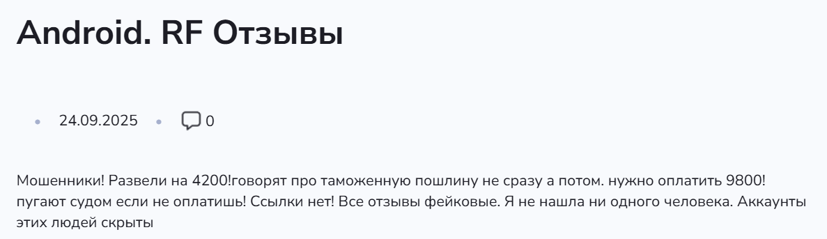 «Андроид РФ» — типичный скам, рассчитанный на наивных пользователей. Обещают дешёвые смартфоны, а в итоге вымогают предоплату и несуществующие таможенные пошлины. После получения денег просто исчезают. Не ведитесь на этот развод!