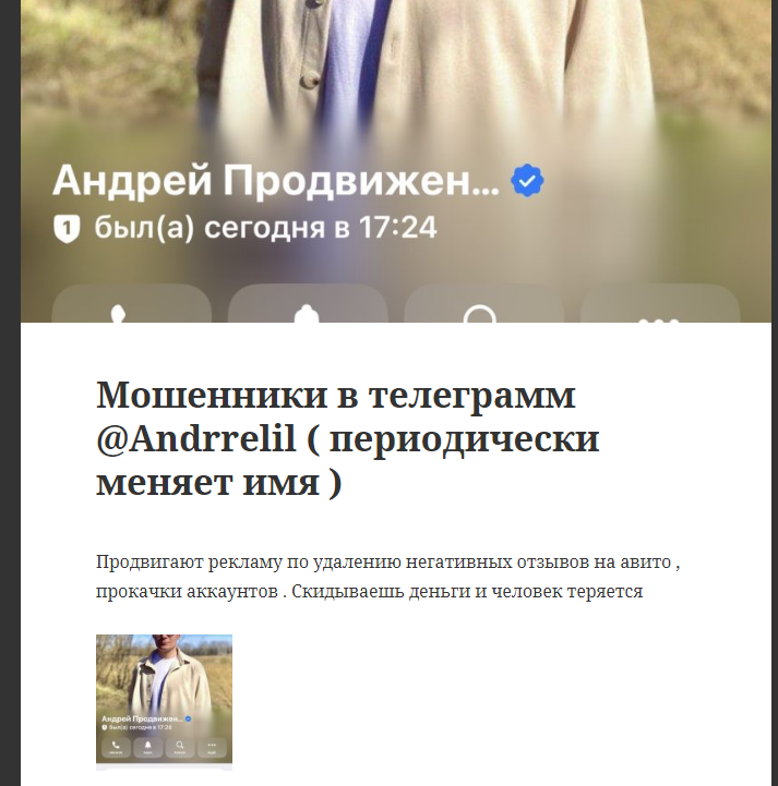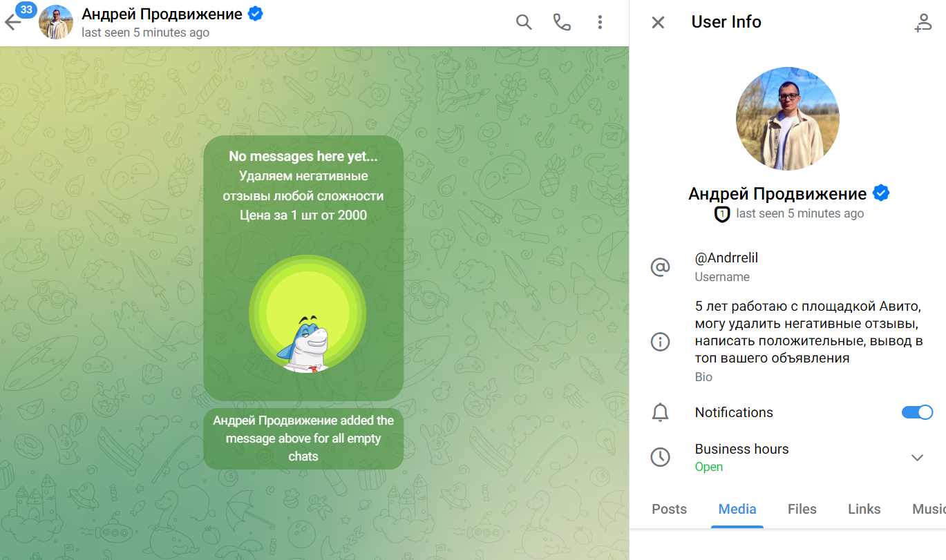 Андрей Продвижение — это Telegram аккаунт эксперта на площадке Авито, который продвигает услуги по продвижению постов. Кроме того, Андрей обещает помощь с удалением негативных отзывов, уверяя в своевременном выполнении работы. В статье мы расскажем все, что известно о создателе тг-страницы и его репутации.
