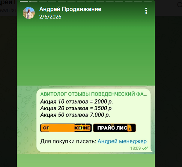 Как известно, Андрей продвигает свои услуги через паблики в социальных сетях. Одним из таких является Авитолог Отзывы. Из доступных скриншотов, клиенты могут приобрести позитивные отзывы на Авито по такой цене: