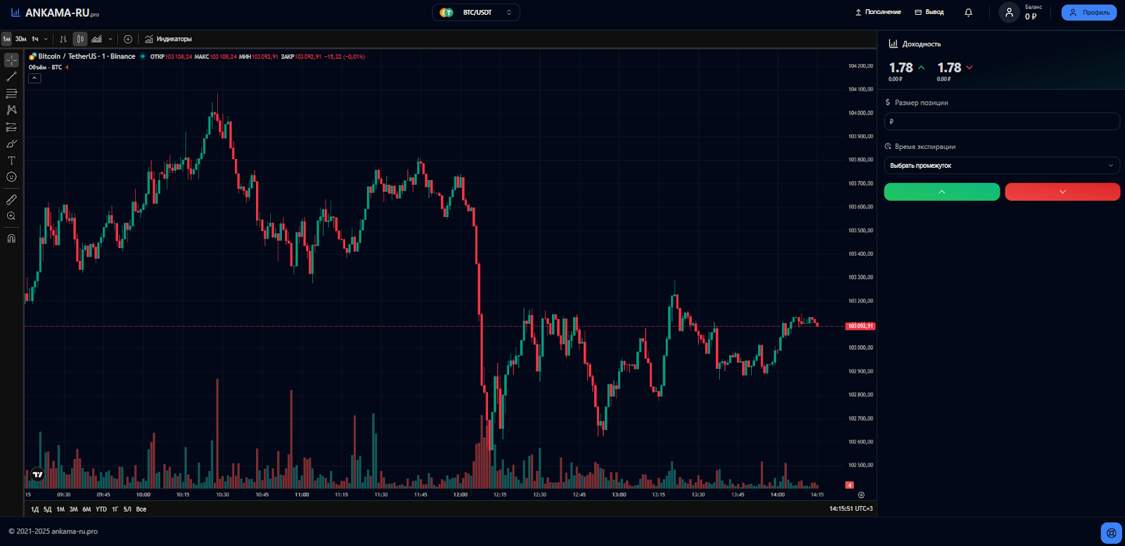 Платформа для заключения сделок кажется странной, в левой части экрана представлены инструменты для изменения графика, но они бесполезны и не влияют на общую картину. Справа находится поле для заключения сделок, оно включает всего 2 кнопки, дополнительного функционала не предусмотрено.
