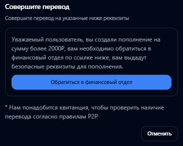 При попытке оформить заявку пользователь сталкивается с предупреждением, что в автоматическом режиме внести деньги не получится. Трейдеру предлагают обратиться к администрации брокера, чтобы получить реквизиты для безопасного перевода – вероятно, пополнение происходит в формате P2P, что совсем ненадежно.