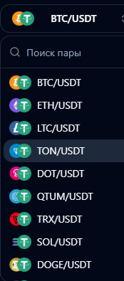 Узнать о том, с какими активами брокер позволяет работать, клиент сможет только после регистрации – их список представлен в терминале для торговли. Таким образом мы выяснили, что на сайте доступны только связки криптовалют в паре с USDT, ценные бумаги, акции или сырьевые облигации не поддерживаются.