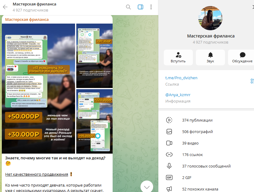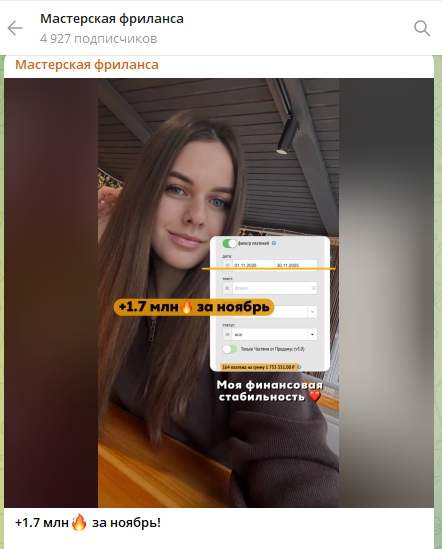 Тг-каналы, такие «Мастерская Фриланса» с адресом «Pro dvizhen», используются для прогрева аудитории. Здесь постоянно транслируется мысль, что работа в офисе – это путь в никуда. Якобы истинная свобода достижима только через её кураторство.