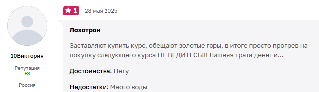 Многие жалуются на то, что «уникальные методики» на поверку оказываются лишь инструкциями по перепродаже этих же самых курсов другим людям. По сути, участники попадают в замкнутый круг, где продукт – это право продавать тот же продукт. Попытки вернуть деньги за бесполезный материал обычно игнорируются или натыкаются на агрессию со стороны службы поддержки.
