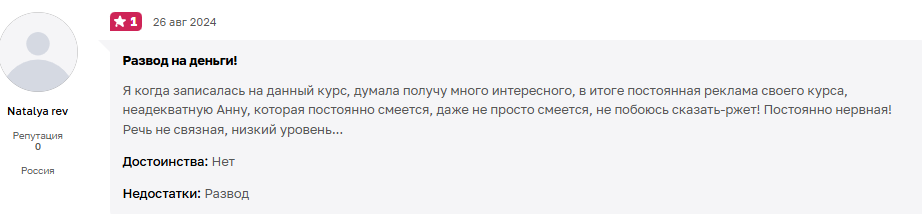 Если же выйти за пределы контролируемых автором ресурсов, то восторженный фон резко меняется на скепсис. Реальные люди часто отмечают, что после оплаты обучения они получают доступ к общеизвестной информации, которую можно найти в бесплатном доступе за пять минут.