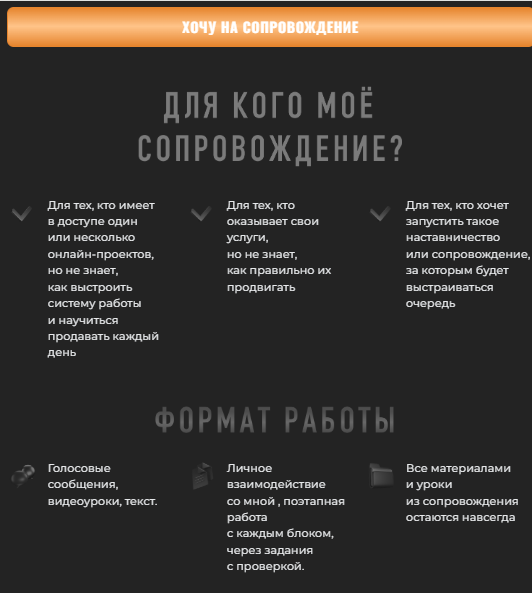 - «VIP / Личное наставничество» – индивидуальная работа с автором проекта, помощь в поиске первых клиентов.