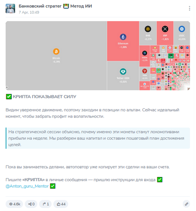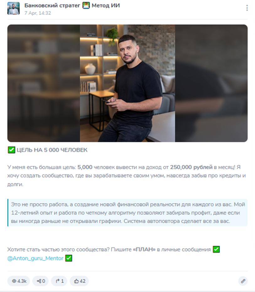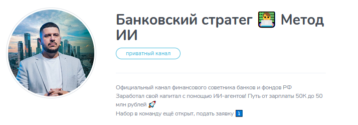 Телеграмм канал «Банковский стратег Метод ИИ» заявлен в качестве официального ресурса некоего Антона. О себе он говорит, как о финансовом советнике, работающем с фондами и банками. Заявляет, что свой капитал заработал на трейдинге, якобы смог подняться от зарплаты в 50 тысяч до 50 миллионов. Всем желающим предлагает присоединиться к его команде для совместного заработка.