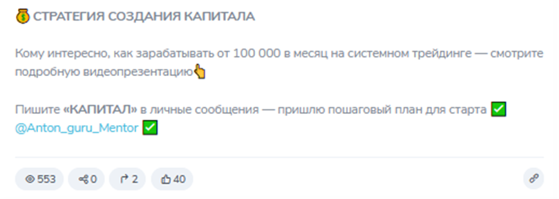 На своем канале Антон публикует прогнозы и короткие заметки, сопровождаемые приглашениями к совместной торговле. Из записей становится понятно, что он предлагает копирование сделок. Однако никакой статистики или аналитических выкладок не предоставляет. Фактически, клиентам предлагается рисковать собственными средствами, полагаясь на честное слово анонимного трейдера.