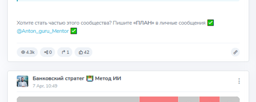 Телеграмм канал Банковский стратег Метод ИИ отзывы пользователей пока не получил. Это официальная группа, владельцем которой указан некий Антон. Себя он позиционирует в качестве финансового советника неназванных фондов и банков. Всем подписчикам предлагает набор в собственную команду трейдеров и обещает прибыли не меньше 30-50%. Но о деятельности этого «финансиста» ничего не известно. Свою личность он скрывает, верифицированную статистику торгов не публикует.