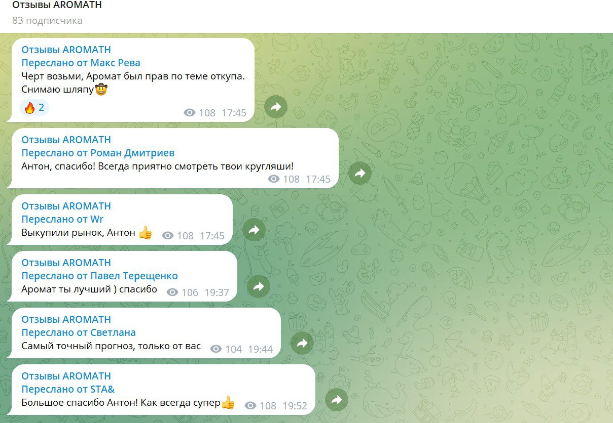 Чтобы собирать отзывы, Антон создал специальный Телеграм-канал – Отзывы AROMATH. Предлагаем вам самим оценить информативность собираемых тут отзывов. Заодно обратите внимание на почти равное количество их просмотров.