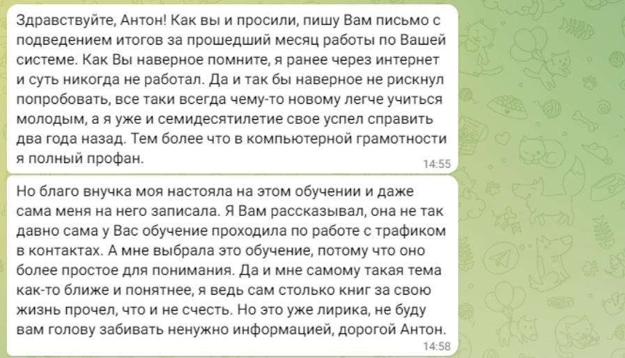 Проверка показывает, что Антон Рудаков отзывы получил очень неоднозначные. Если смотреть то, что опубликовано на его сайте, то там исключительно позитивные результаты обучения и сотрудничества. Все осваивают программу, начинают зарабатывать, внучки подписывают бабушек, а те в свою очередь, не веря в свои возможно, могут достигать немыслимых для себя заработков.