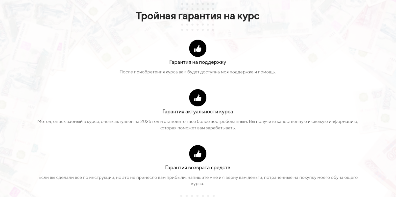 Мы не рекомендуем покупать данные курсы и следовать по их схеме, даже если найдете информацию бесплатно. Это очень примитивные методики, которые почти не применимы на практике, за исключением некоторых случайностей. О серьезных заработках говорить не стоит.