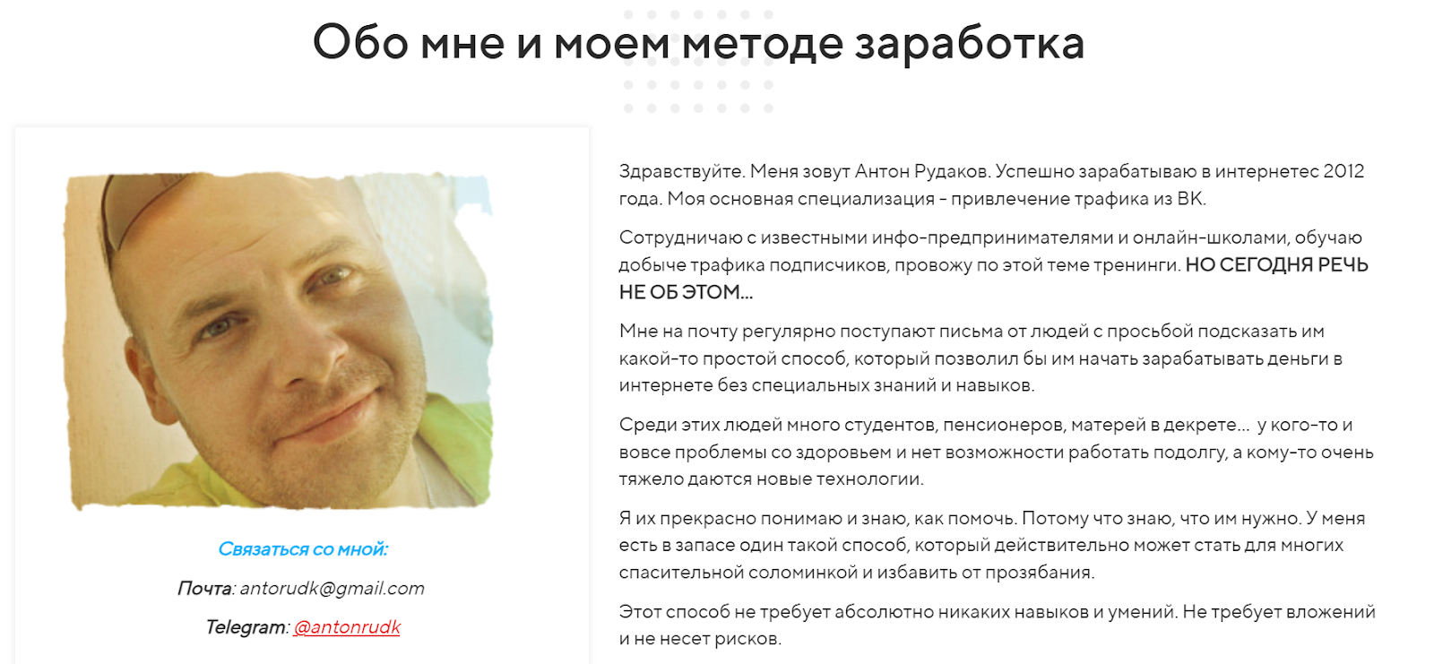 Антон Рудаков является автором нескольких курсов по заработку, которые должны приносить пользователям по несколько десятков тысяч рублей в месяц без больших усилий. Автор предлагает обучение в разных сферах, которое могут освоить люди без большого опыта работы в интернете. В этой статье мы рассмотрим, действительно ли автор предлагает интересные материалы, можно ли на них заработать или это очередной развод людей на деньги за обучение без результата.