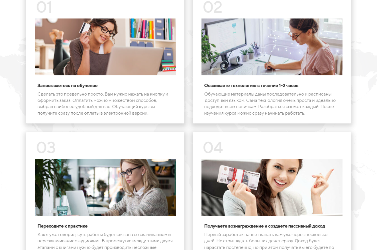 О курсе «Антон Рудаков заработок на аудиокнигах» отзывы говорят, что автор предлагает брать бесплатные аудиокниги, потом размещать фрагмент на ютуб-канале и указывать ссылку, где можно купить полный вариант. Соответственно, он предлагает продавать бесплатные вещи. Схема вполне может оказаться рабочей, если не учитывать отсутствие этичности такого поступка, но шансов заработать на этом указанную сумму практически нет. Позиционируется все это так, будто люди платят не за бесплатную книгу, а за услуги помощи в ее поиске.