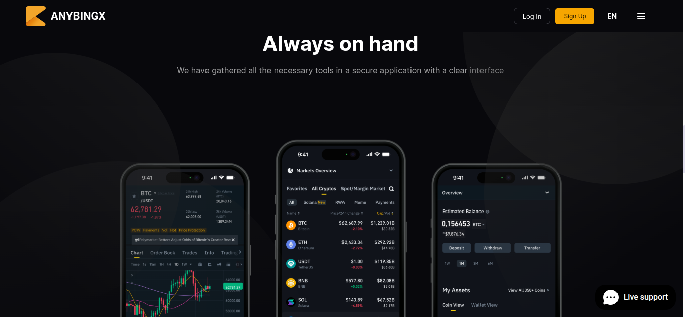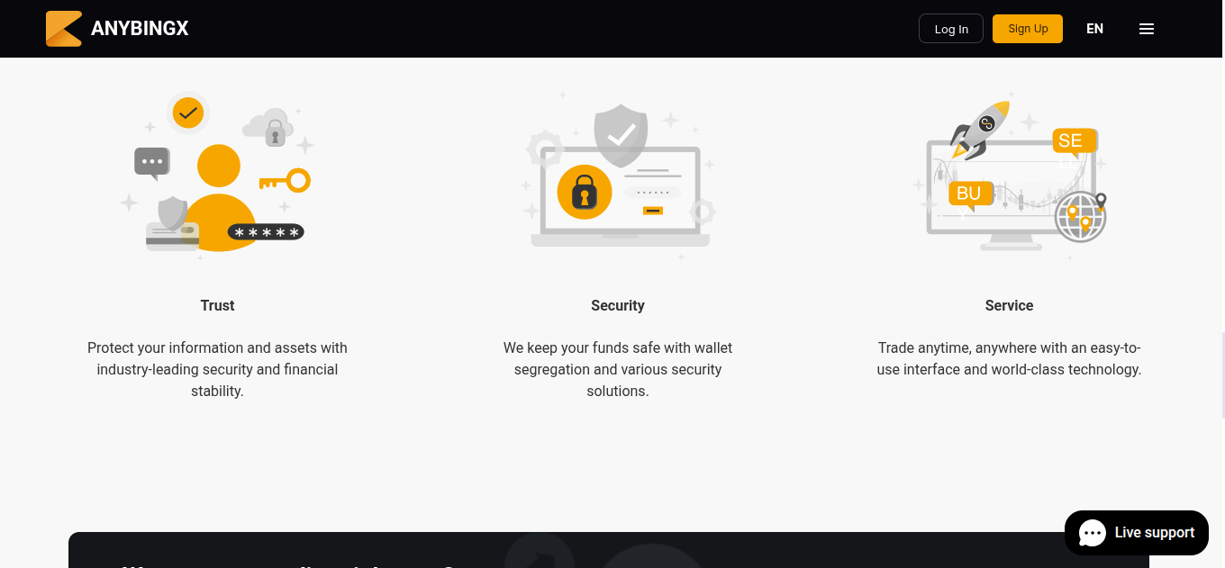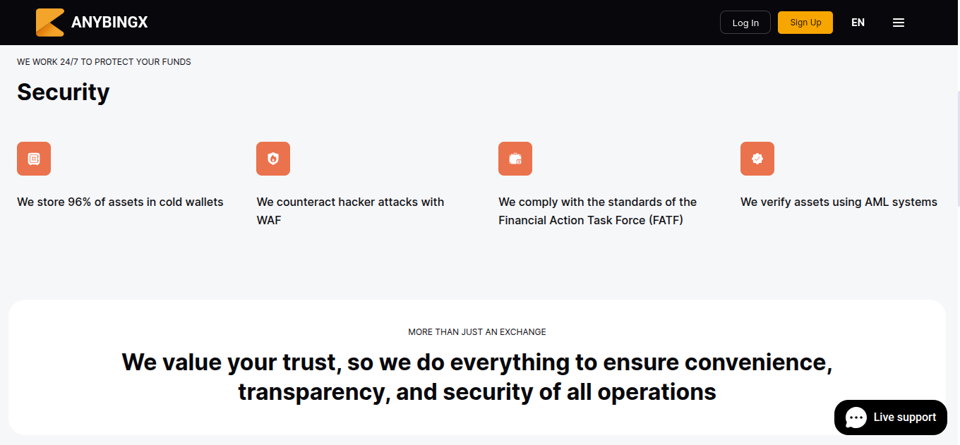 - Активы пользователей сегрегированные. Кроме этого, все капиталы хранятся на холодных кошельках, благодаря чему злоумышленники не смогут получить к ним доступ, даже если инфраструктура AnyBingx com будет взломана.