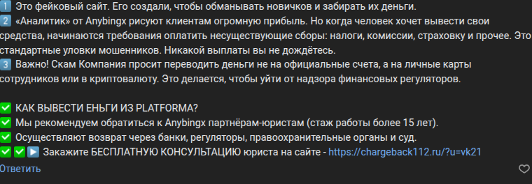 Необходимость дополнительной KYC команда аргументирует наличием подозрительных платежей. Когда пользователь платит, то разработчики AnyBingx com придумывают новые услуги и так до обнуления счета.