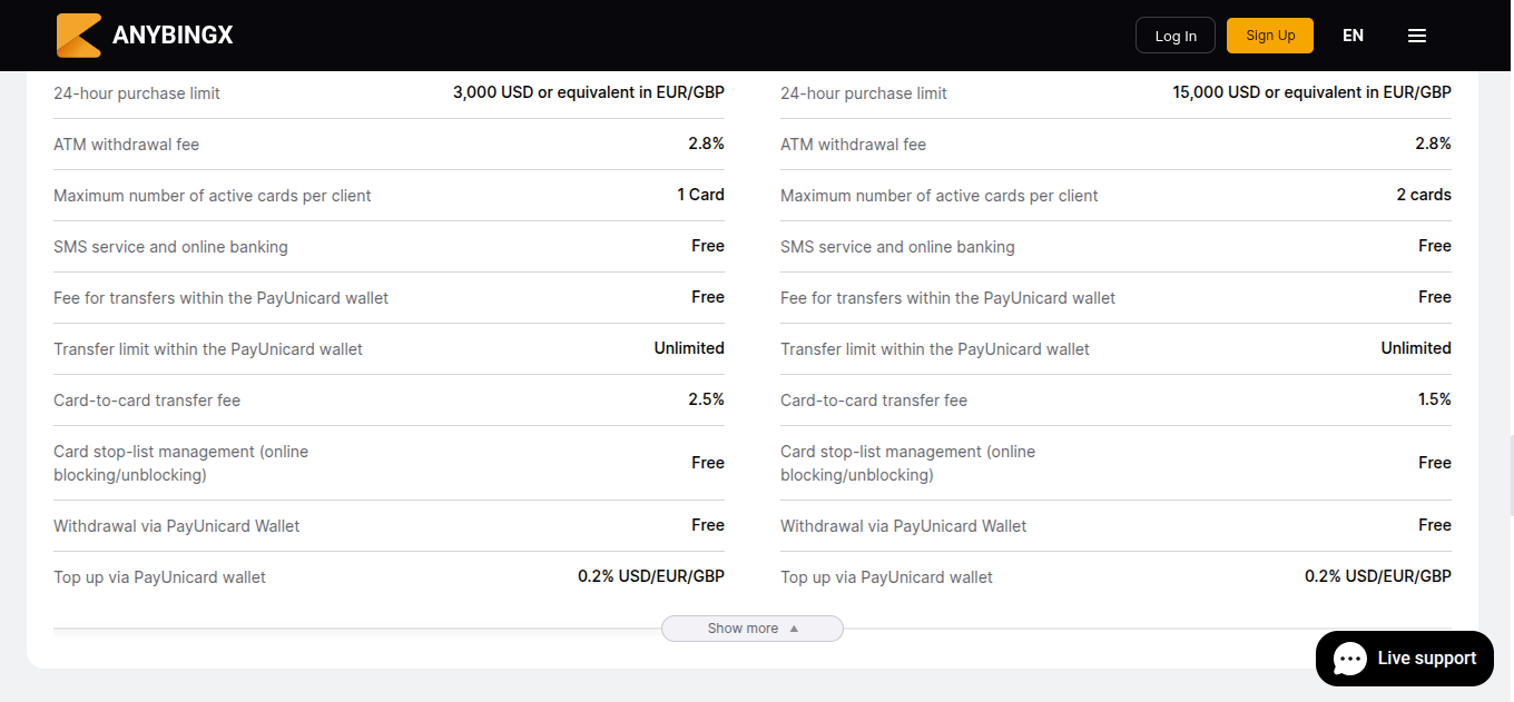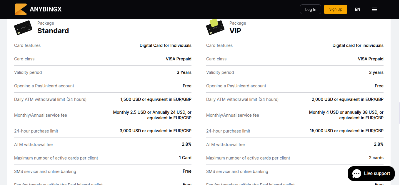 - Standard. Длительность — 3 года, привязка к PayUnicard бесплатная. Снять в сутки можно 1500 долларов или эквивалент. За обслуживание пользователи биржи AnyBingx com платят 2.5 доллара в месяц или 24 в год. Получить в сутки можно 3000 долларов и эквиваленте. Перевод с карты на карту за 2.5%.