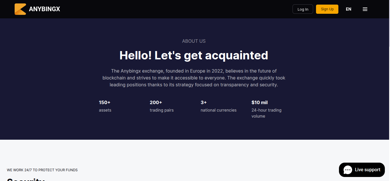 В блоке About Us сказано, что брокер работает с 2022 года и является лидером в сфере брокерских услуг на территории Европы. С чего это взяли менеджеры AnyBingx com непонятно, ведь на рынке есть множество реальных лидеров, например, Binance. Еще нам предстоит проверить информацию насчет старта в 2022 году.