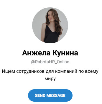 Единственное, что мы знаем об этой девушке — это ее аккаунт в Телеграм @ Rabotahr Online. В описании Кунина кратко сообщает, что «ищет сотрудников для компаний по всему миру».