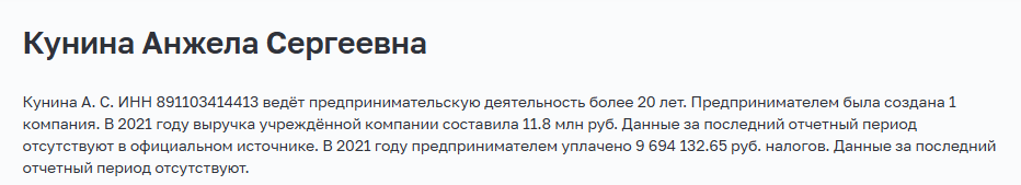 На одном из сайтов в интернете мы нашли информацию, что Кунина А. С. занимается предпринимательством более 20 лет, а за 2021 год выплатила 9 млн руб. налогов. Но мы не можем быть уверены, идет ли речь про данную девушку или про ее полную тезку. Возможно, мошенники просто взяли информацию из открытого реестра и воспользовались ею для скама.