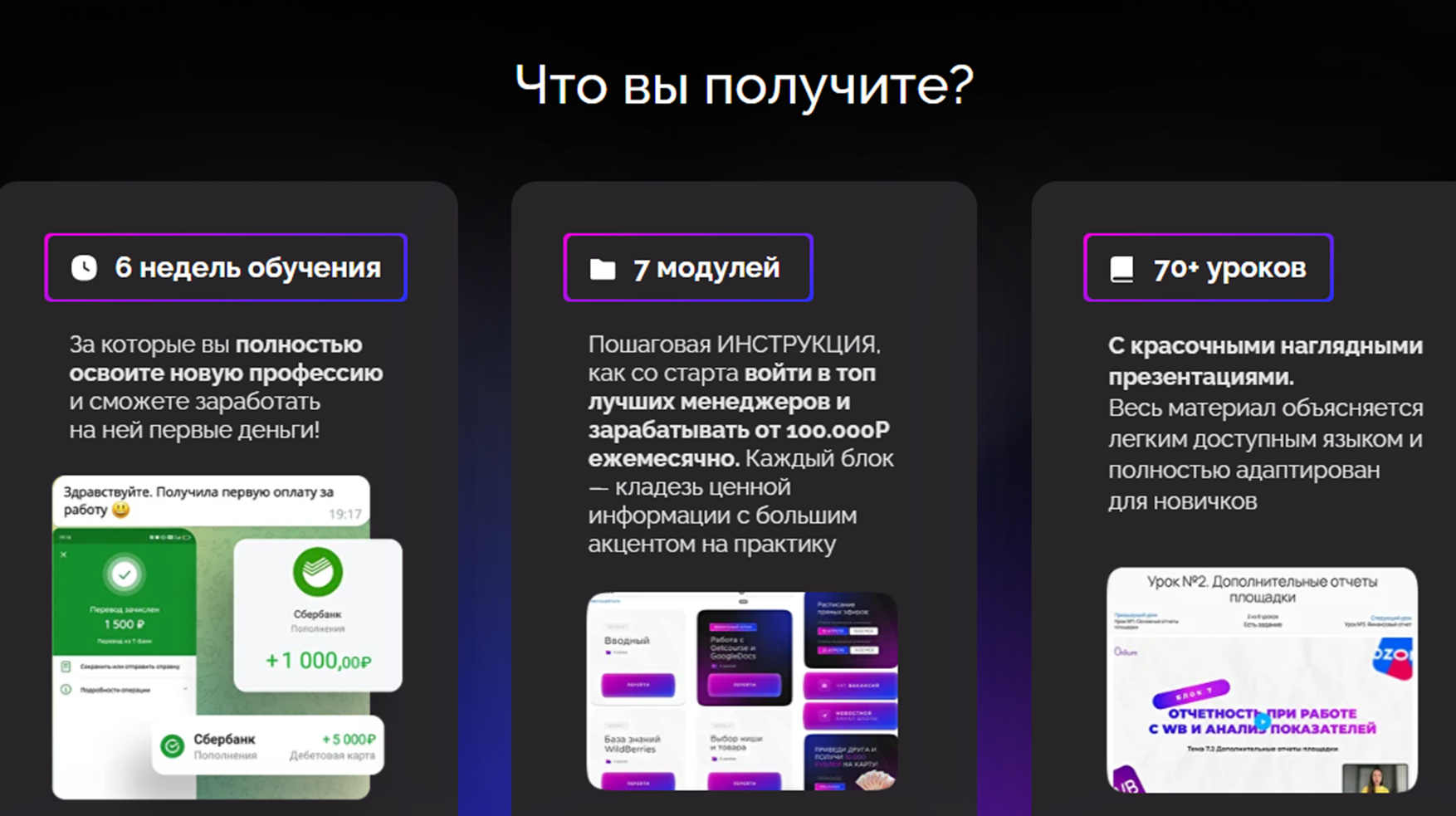 На платформе Shework ru можно ознакомиться с содержанием обучающей программы «Менеджер WB». Ученикам обещаны следующие преимущества: