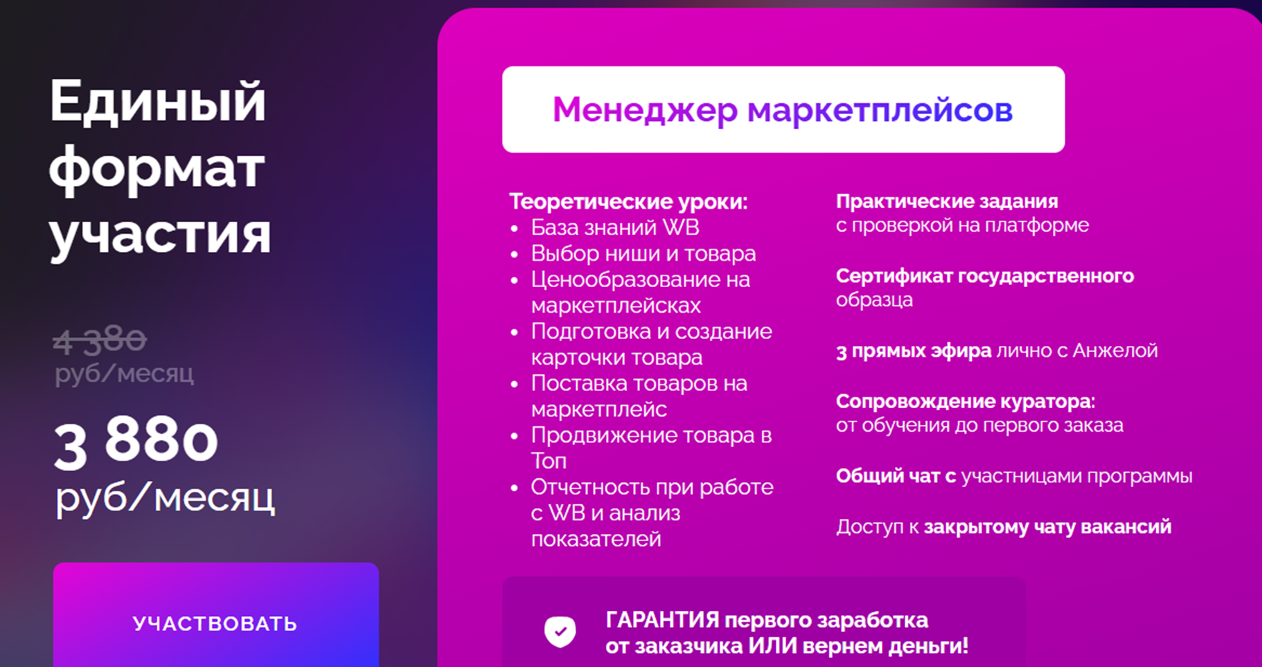 Формат участия предусмотрен единый для всех. Стоимость 3880 рублей в месяц. Плюс, ученики получают бонусов на общую сумму свыше 128 000 рублей. Примечательно, что ученикам школы «Онлиум» Анжелы Шнайдерман обещан возврат денег, в случае, если обучение не оправдает ожиданий.