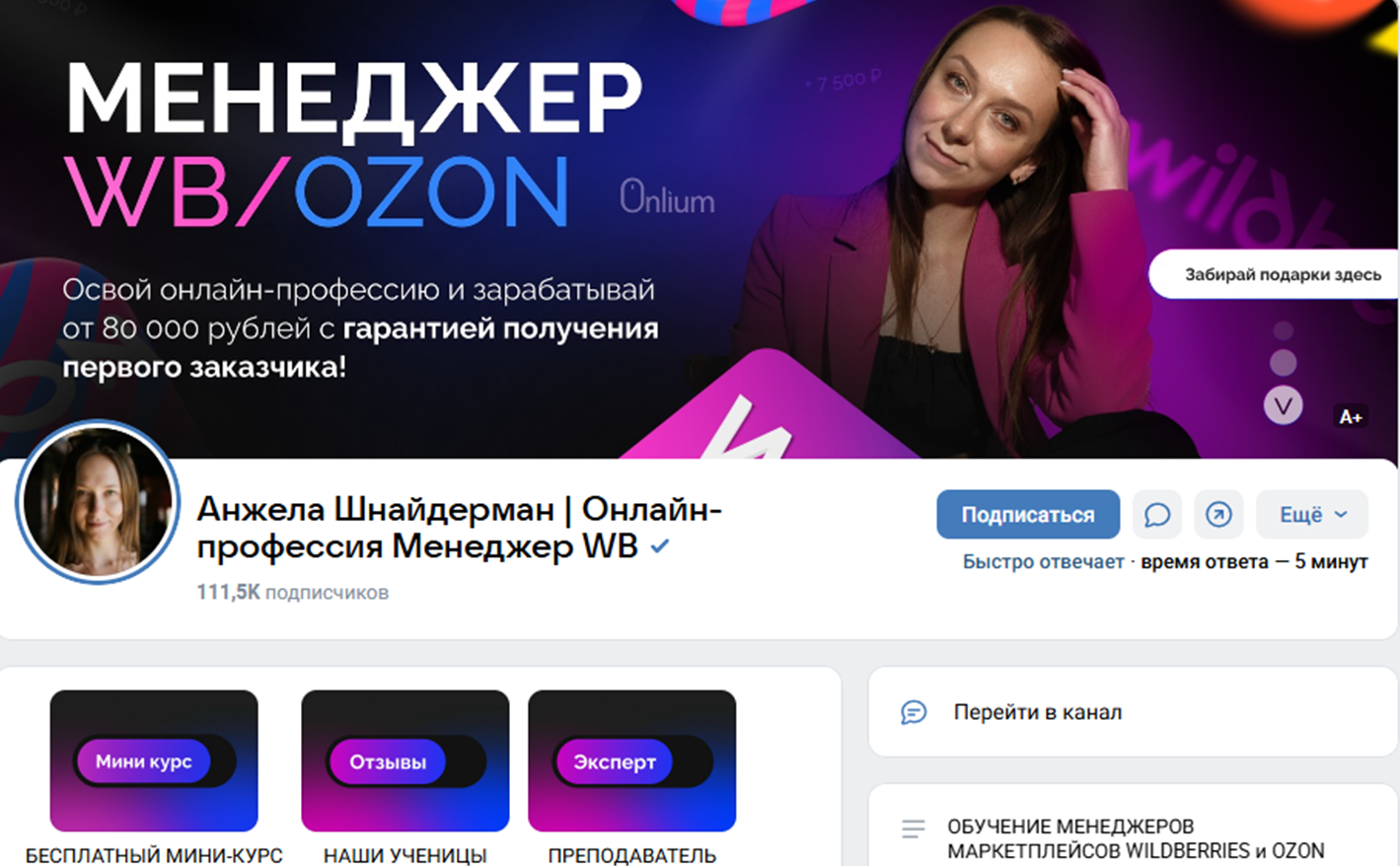 В паблике ВКонтакте «Анжела Шнайдерман онлайн-профессия менеджер WB» порядка 111 000 подписчиков.