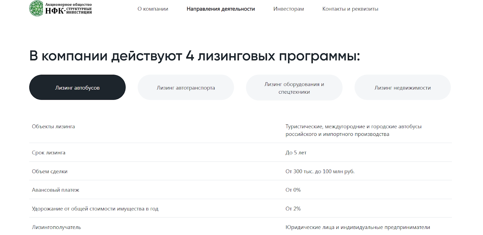 - лизинг автобусов. Срок до 5 лет, сделка суммой от 300 т. р. до 100 млн р. Авант составляет 0%, удорожание 2%;