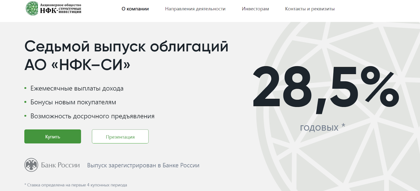 Nfksi ru предлагает инвестиции во внебиржевые облигации НФК-СИ. По словам основателей, в обращении 6 выпусков со стоимостью 1 тыс. р. за бумагу: